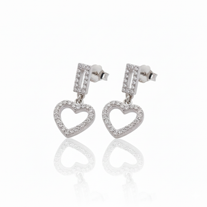 These earrings showcase a gleaming open heart charm suspended from a rectangular geometric post, fully encrusted with dazzling stones. The minimalist yet artistic lines create an eye-catching movement and stylish versatility.