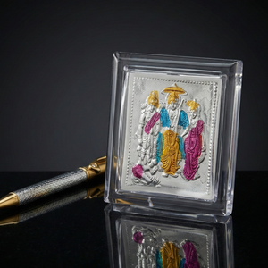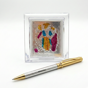 Accompanying the pen is a beautifully embossed Ram Darbar silver plaque, enclosed within a crystal-clear protective frame. The finely detailed artwork portrays Lord Ram, Sita, Lakshman, and Hanuman in vibrant color accents over a radiant silver base. The relief work captures intricate traditional patterns, giving the piece a dimensional and sacred presence. When displayed together, the pen and plaque create a harmonious composition that radiates warmth and reverence.