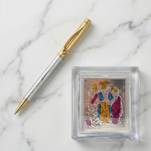 Designed to reflect prosperity, devotion, and refined taste, this premium pen set blends spiritual symbolism with executive sophistication. The pen features a luxurious gold-toned finish complemented by a textured silver grip section that enhances both visual richness and writing comfort. The polished gold clip and smooth tapered body create a sleek, balanced silhouette, while the precision detailing adds depth and craftsmanship to every angle. The weight distribution ensures a steady, effortless writing experience, making it suitable for both daily professional use and special occasions.