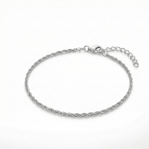 A sleek 92.5 sterling silver rope chain anklet crafted for daily wear. The twisted chain design reflects light beautifully and gives a premium finish. Lightweight, adjustable, and perfect for styling with heels, sandals, and barefoot looks.