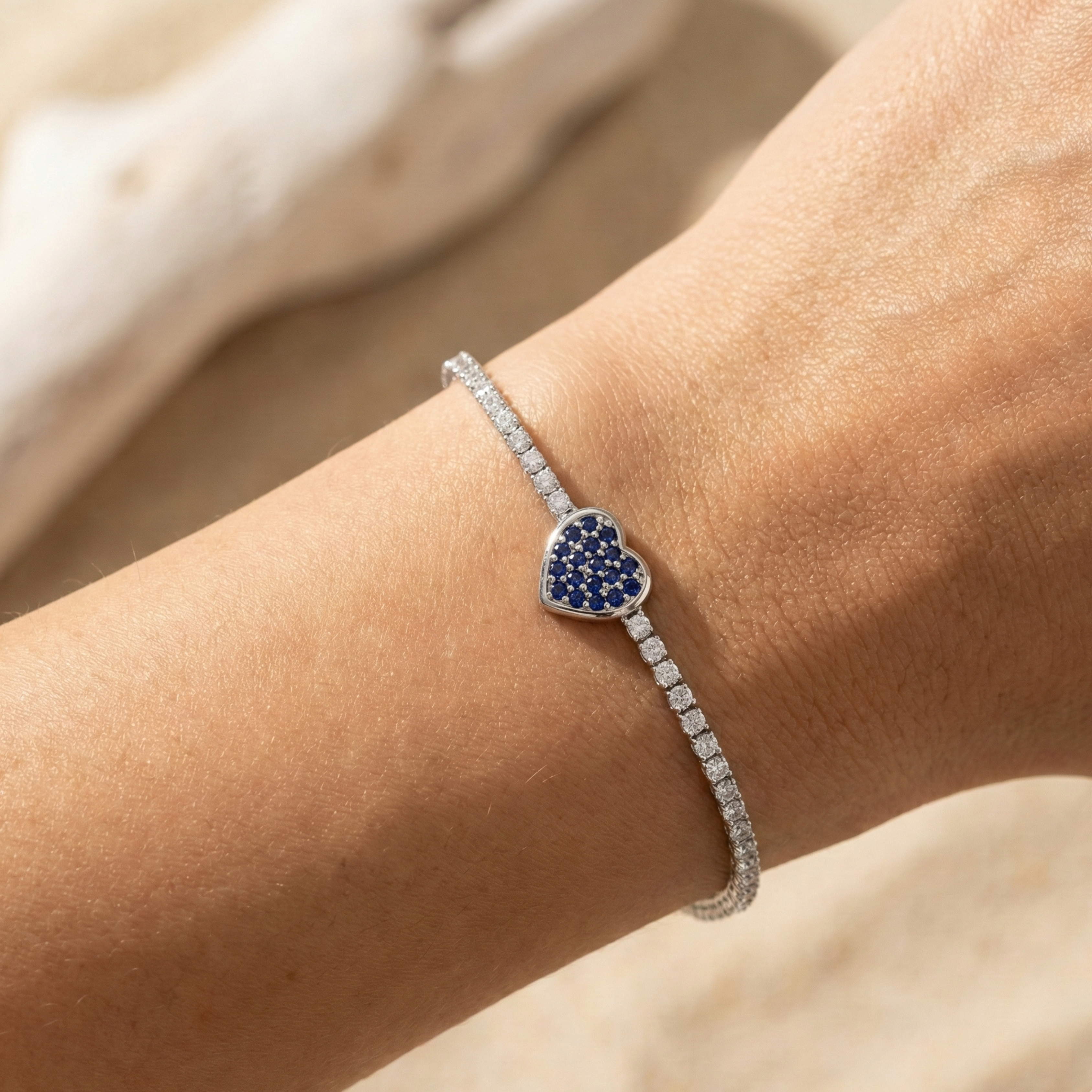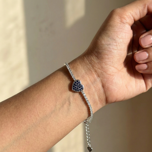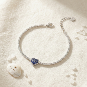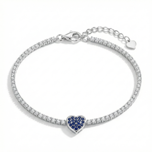 Inspired by the elegance of classic tennis bracelets and the charm of a heart symbol, this piece blends timeless sparkle with a bold blue centerpiece — a bracelet that feels romantic, luxurious, and instantly eye-catching.
