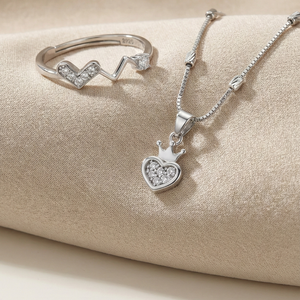 A cohesive heart-themed design across all pieces, featuring a crowned heart pendant, minimal stud earrings, and a delicately shaped heart-accent ring