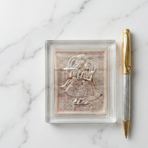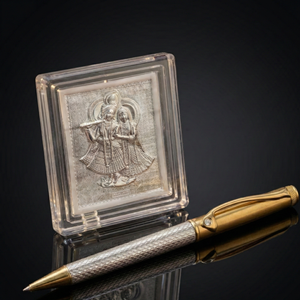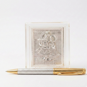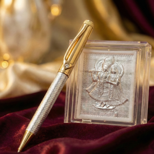 A refined blend of devotion and craftsmanship, this elegant writing instrument is designed for those who appreciate meaning in the details. The pen features a sophisticated dual-tone body combining a textured silver barrel with polished gold accents, creating a timeless and luxurious appearance. Accompanying the pen is a finely detailed Radha Krishna plaque, delicately encased in a crystal-clear protective frame that enhances its sacred presence.