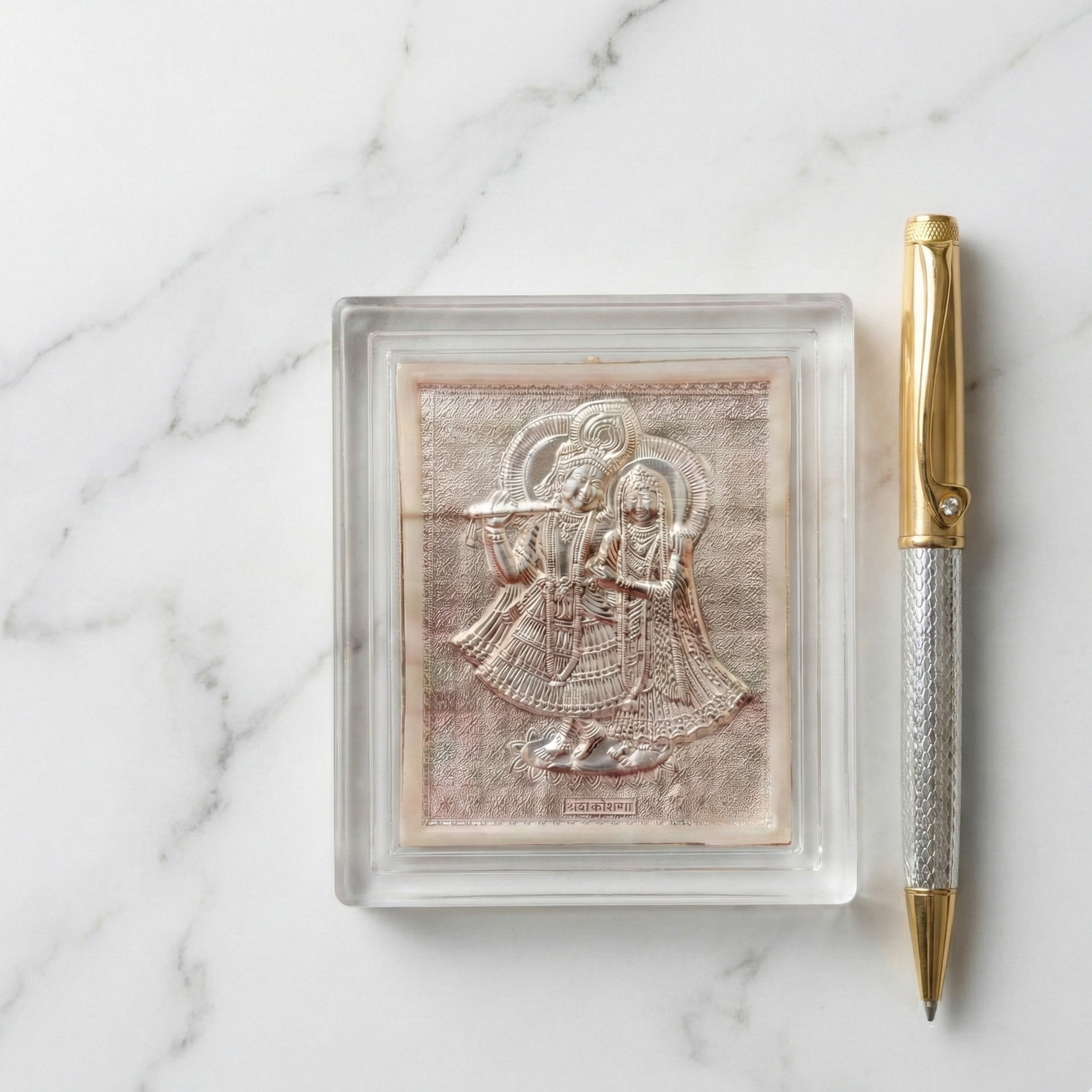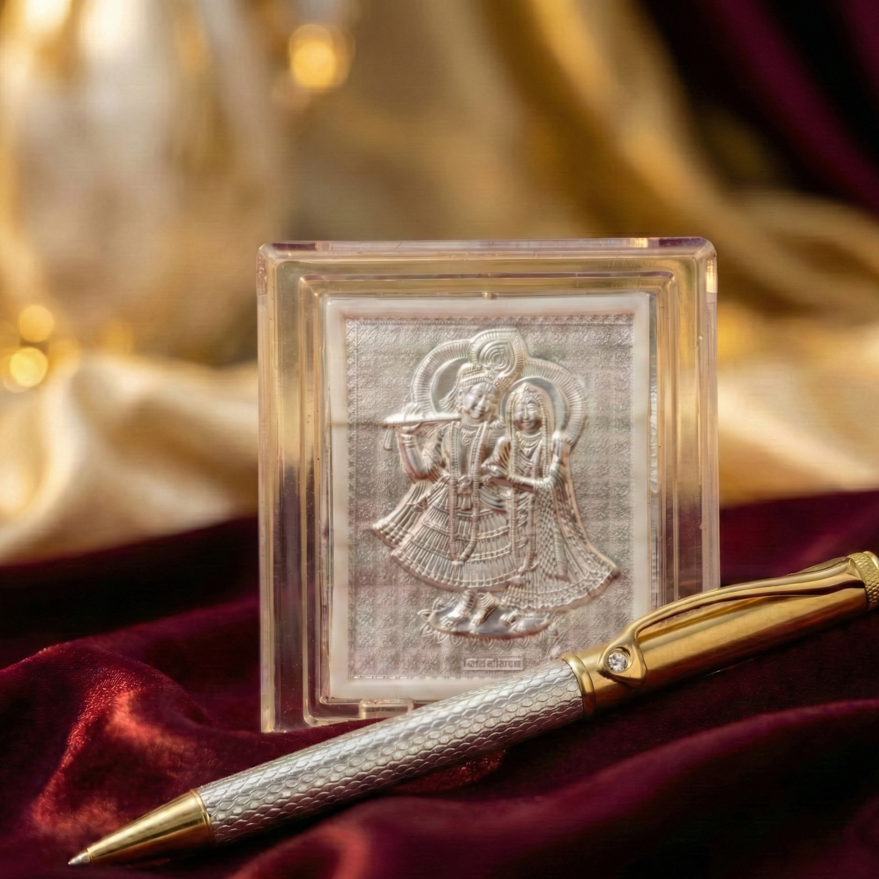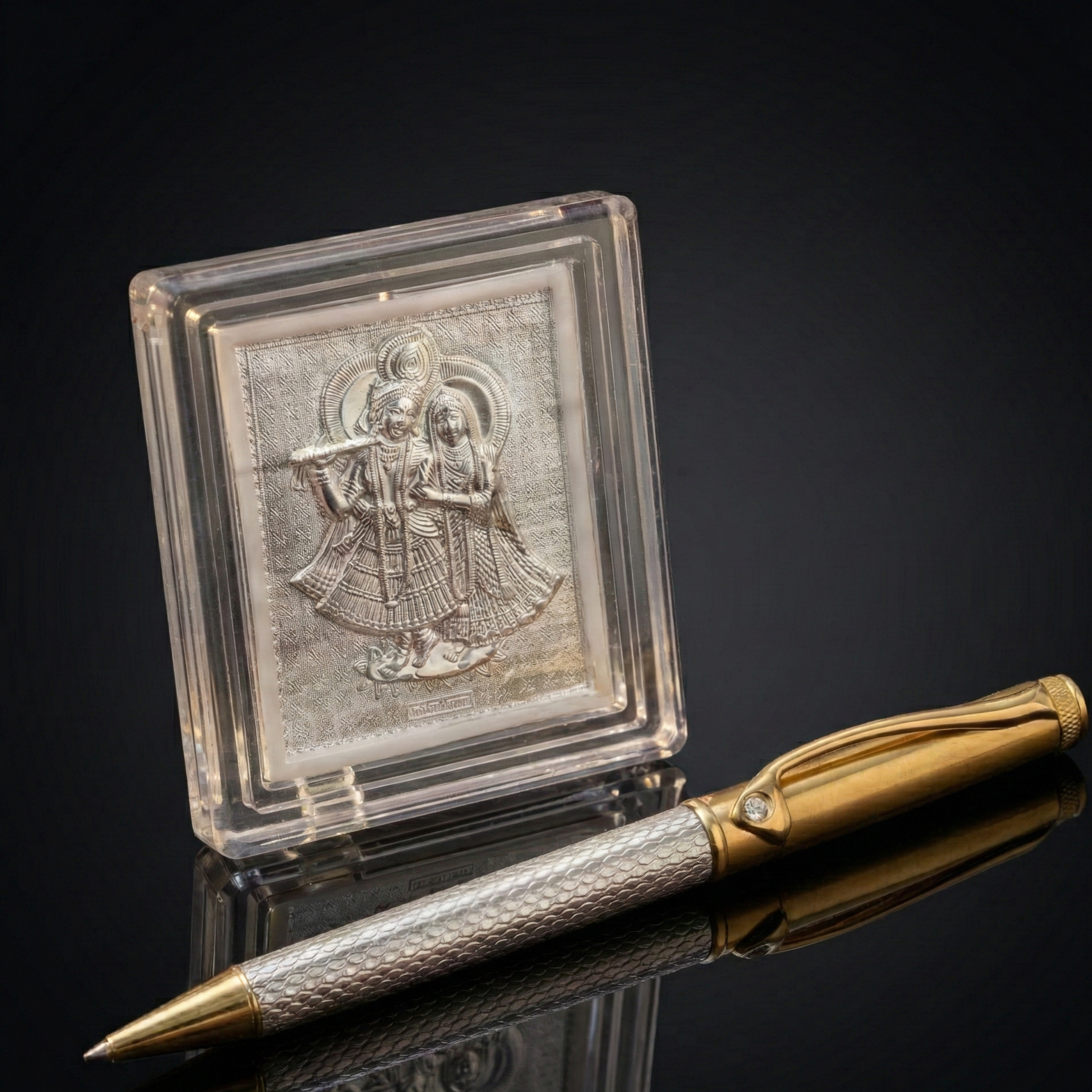 Divine Harmony Gold & Silver Pen with Radha Krishna Plaque