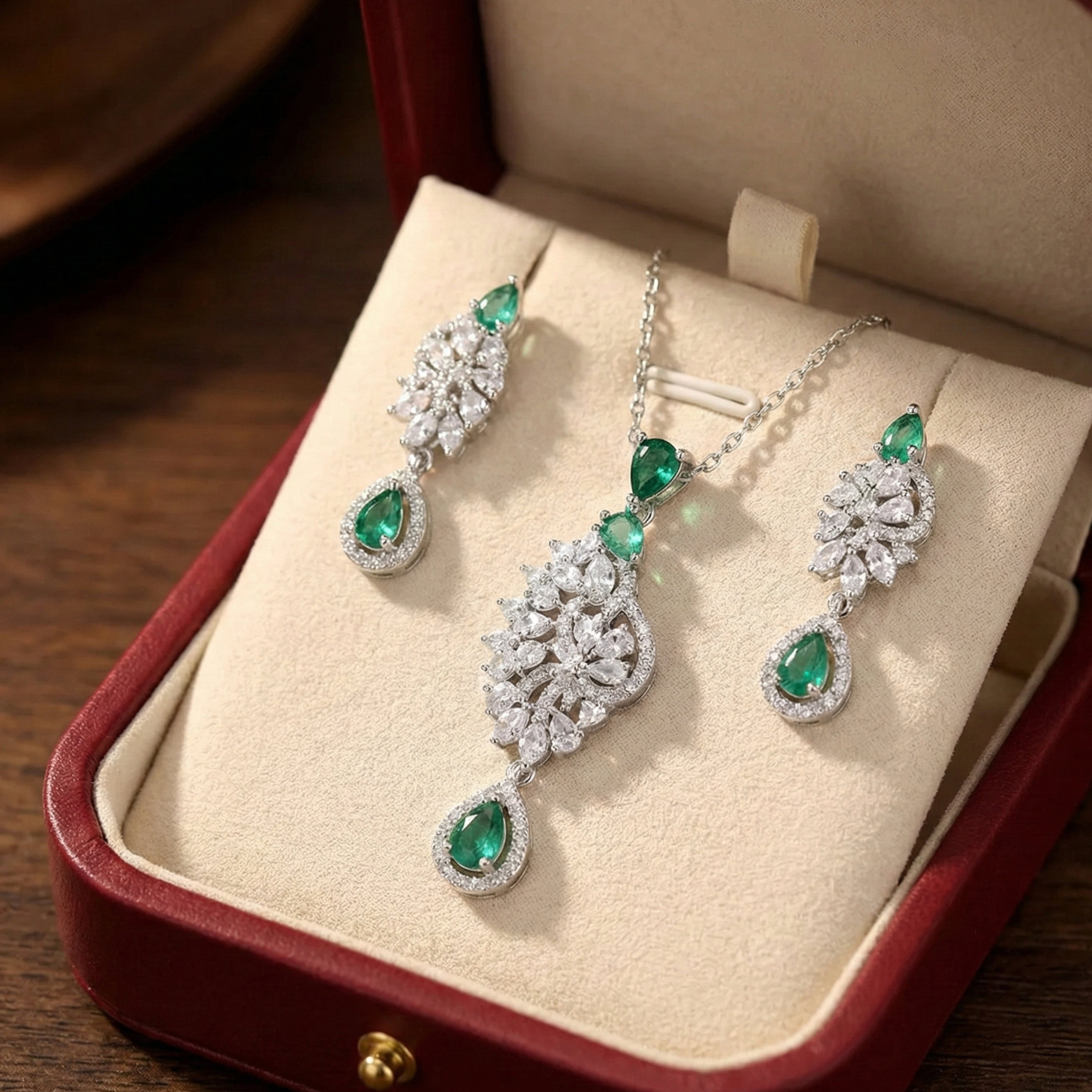- Stunning combination of sparkling stones and vibrant emerald accents