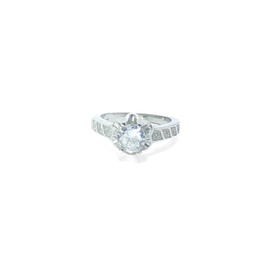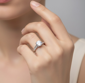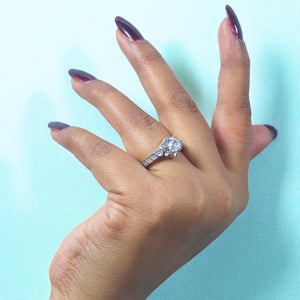 - Design: A brilliant central stone with intricate floral detailing and smaller accent stones along the band.