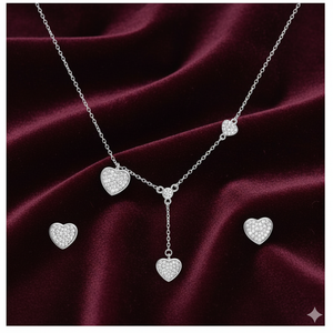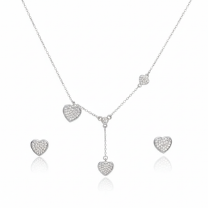 Delicate chain necklace accented with shimmering pavé hearts, paired with coordinated stud earrings for an elegant, harmonious look. Multi-heart details evoke joy and togetherness while pavé crystals ensure dazzling radiance.