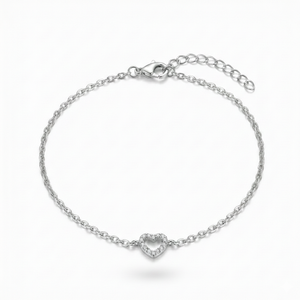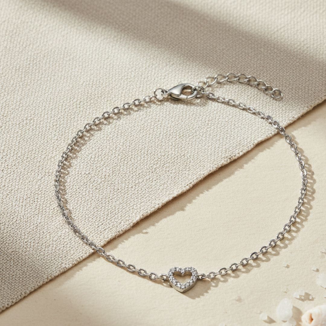 A delicate 92.5 sterling silver anklet featuring a tiny open heart charm studded with shimmering crystals. Lightweight, adjustable, and perfect for daily wear — whether you’re styling it with sandals, heels, or barefoot vacation looks.