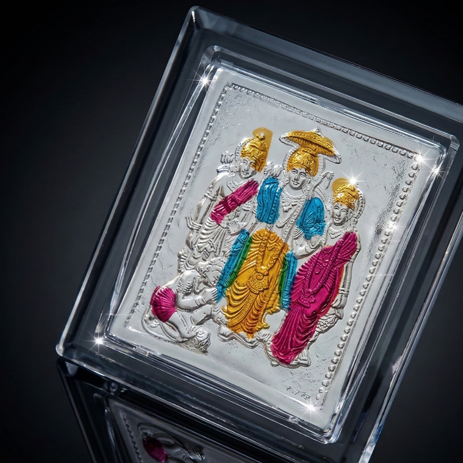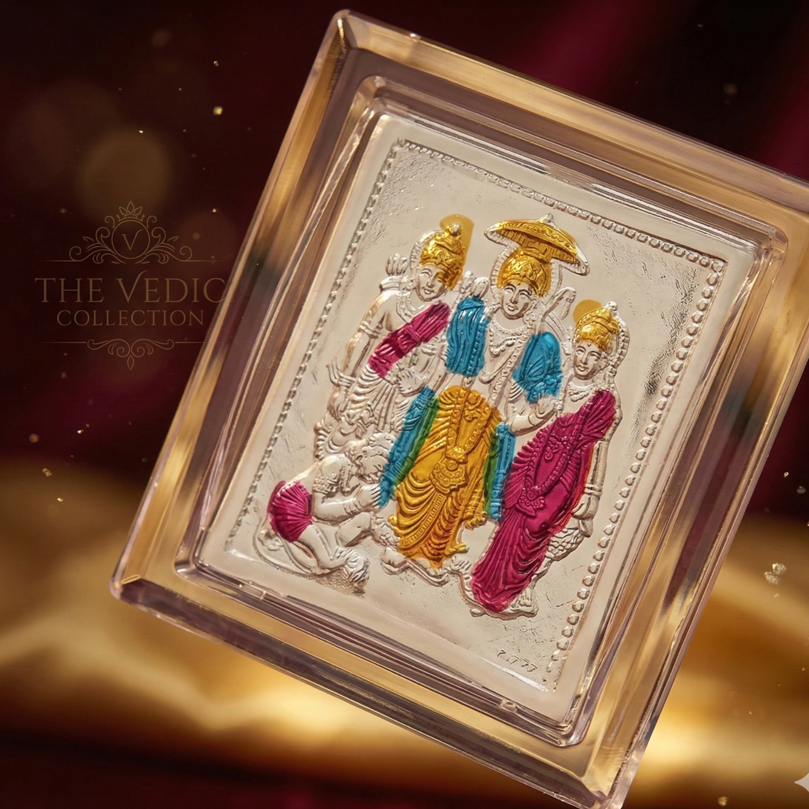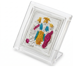 Bring sacred blessings and timeless devotion into your space with this beautifully crafted Ram Darbar Mini Silver Frame. The frame features an intricately embossed silver artwork portraying Lord Ram, Goddess Sita, Lakshman, and Hanuman in vibrant traditional colors. Every detail of the relief work reflects classical craftsmanship, highlighting the spiritual symbolism and cultural heritage associated with Ram Darbar.