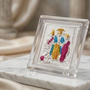 Encased in a durable crystal-clear acrylic frame, the silver plaque is protected while maintaining a clean and modern appearance. The transparent casing enhances the brilliance of the silver design, giving the divine artwork a subtle depth and clarity that stands out beautifully.
