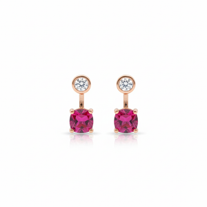 Each earring features a brilliant round-cut cubic zirconia at the top, with a suspended four-prong pink ruby drop for high-impact shine and color. The rose gold-plated setting gives the pair a warm, modern glow.