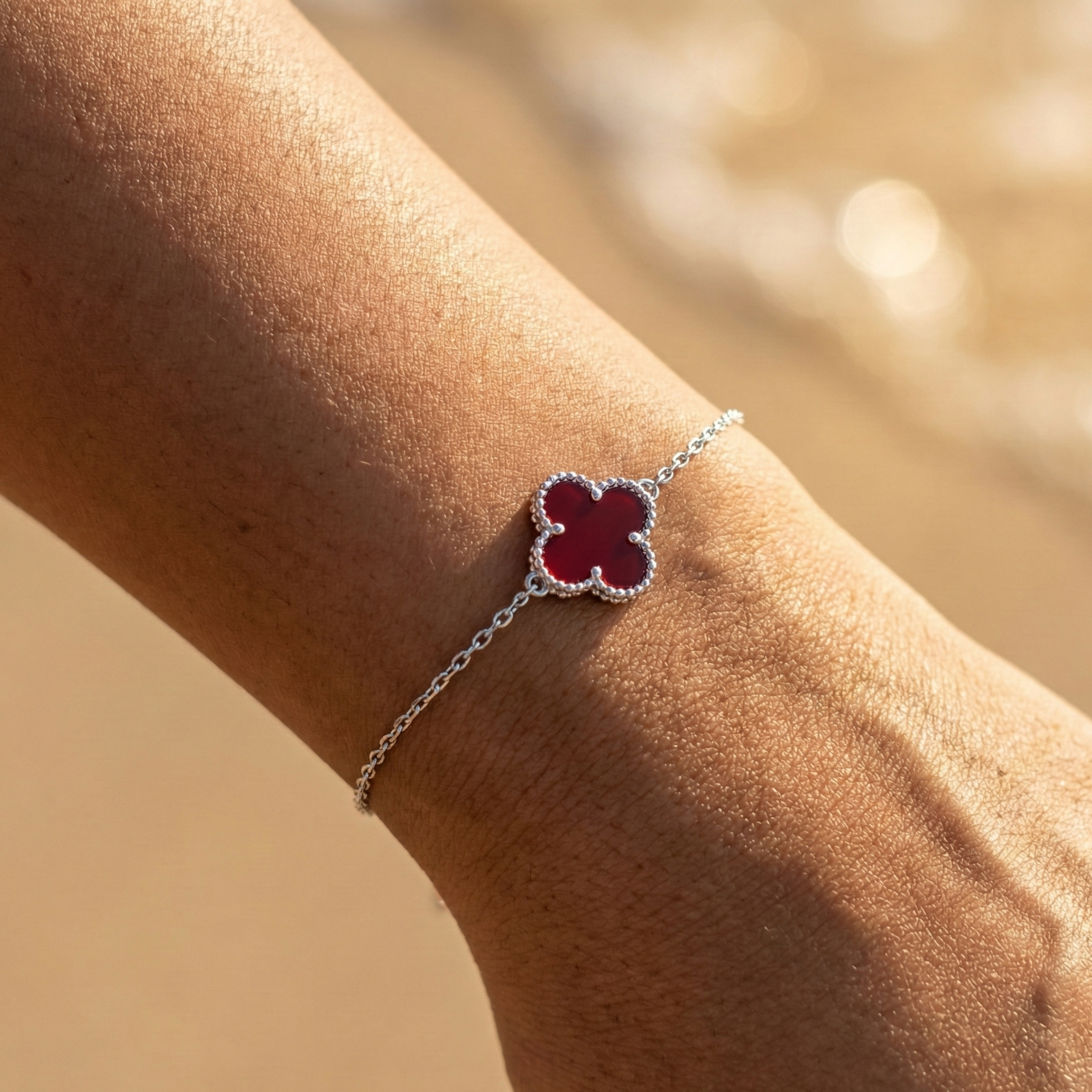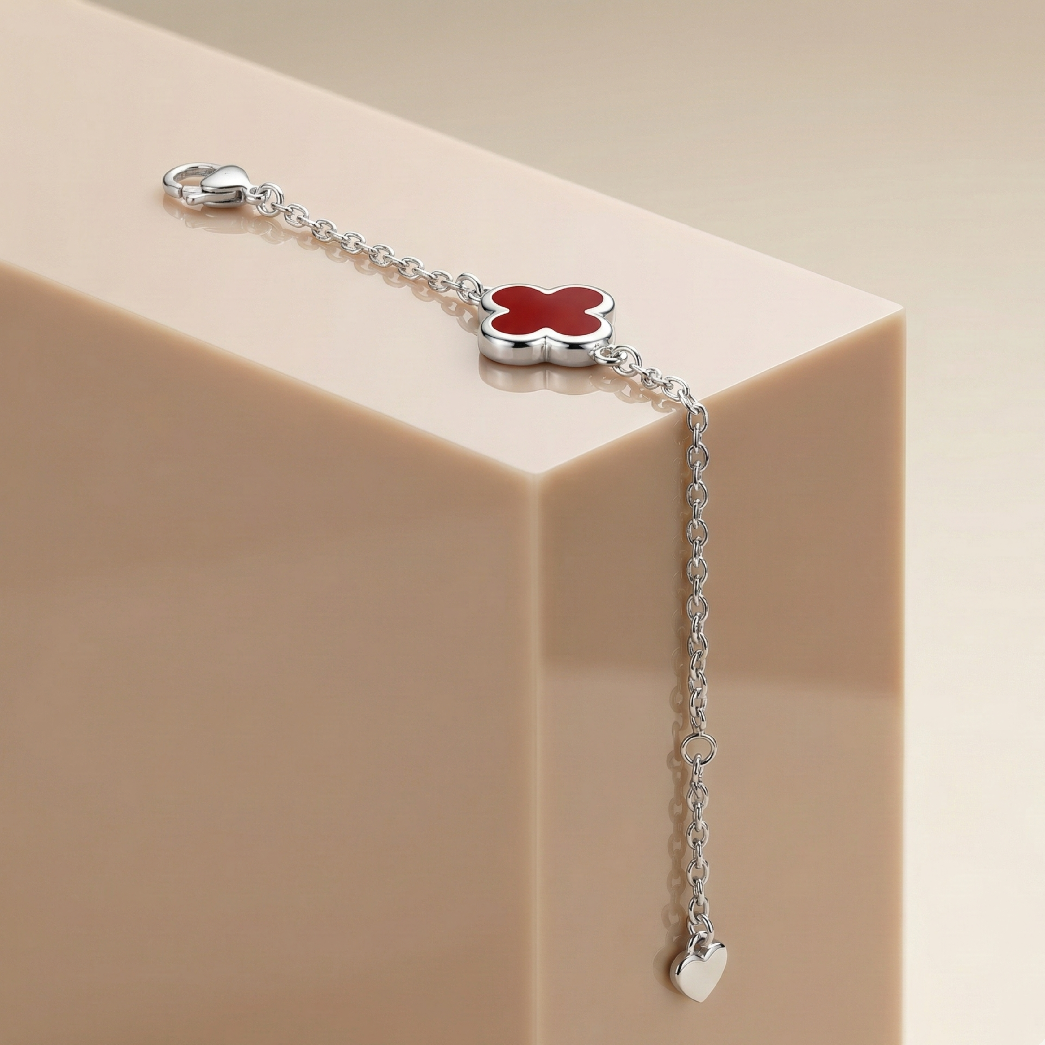 Inspired by the clover symbol of luck and love, this bracelet pairs a rich ruby-red centerpiece with a delicate silver chain. The crystal border adds just the right amount of sparkle — classy, feminine, and premium.