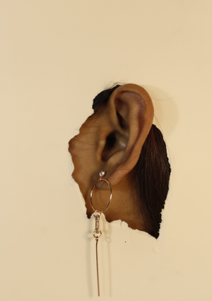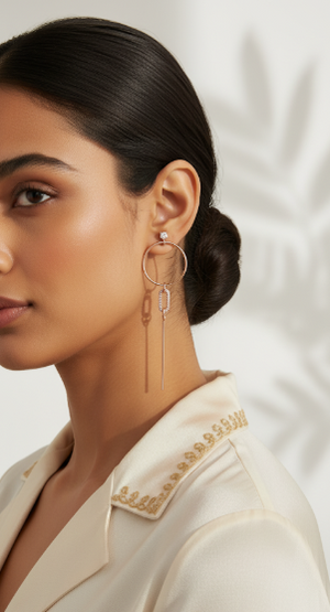 Drawing inspiration from celestial orbits and sleek architectural lines, these earrings are designed for those who love modern elegance with a bold edge. The clean hoop is grounded by a linear drop, creating a beautiful sense of balance and movement.