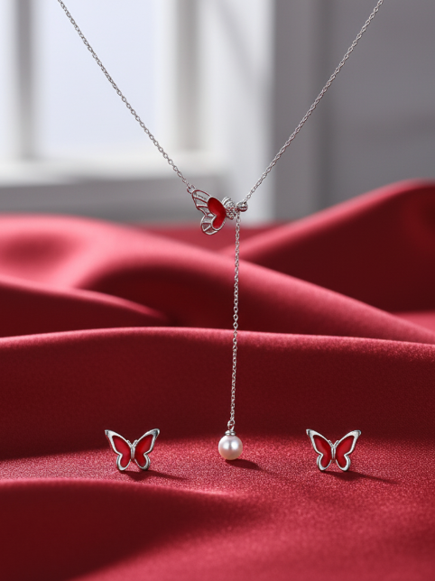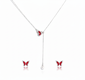 Ruby Air Butterfly Pearl Necklace Set is inspired by the grace of butterflies and the elegance of a single luminous pearl. Crimson wings evoke feeling of freedom and cheerful vitality, while soft silver captures the delicacy of flight.