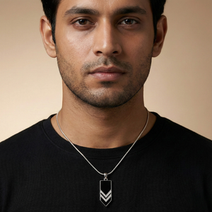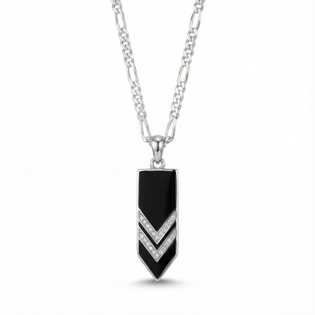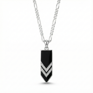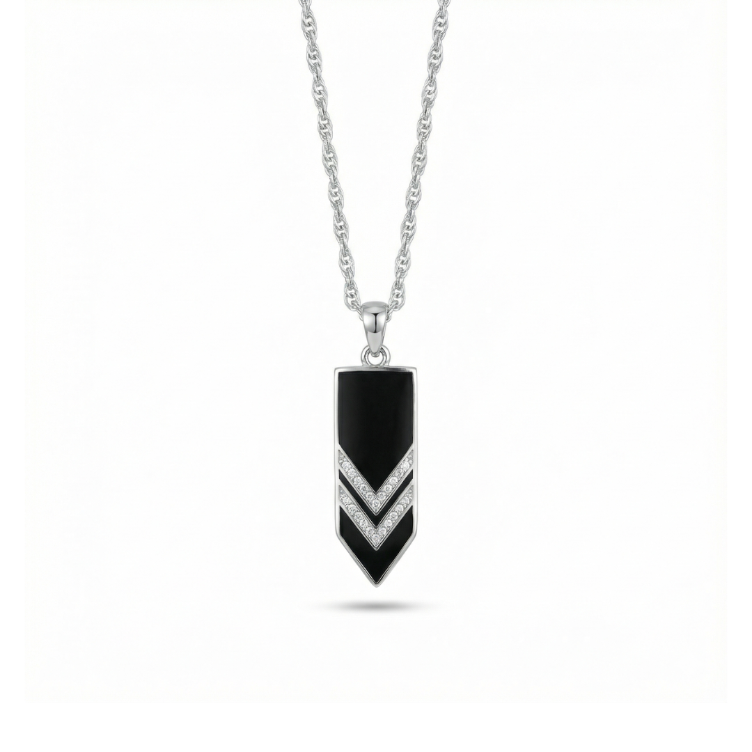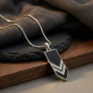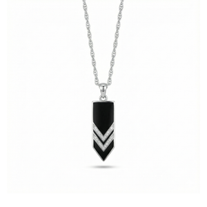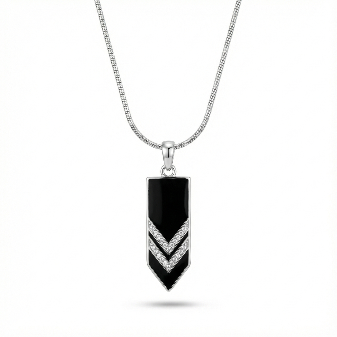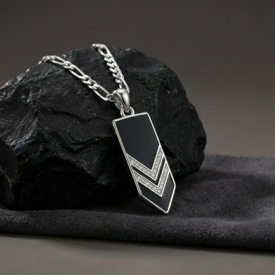 Inspired by sharp geometry and modern minimalism, this pendant is designed for those who prefer structure over ornament. The contrast between the deep black surface and silver chevron detailing creates a bold yet controlled statement.