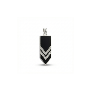 A rectangular pendant with a pointed base, featuring a black inlay surface accented by layered chevron-style silver detailing