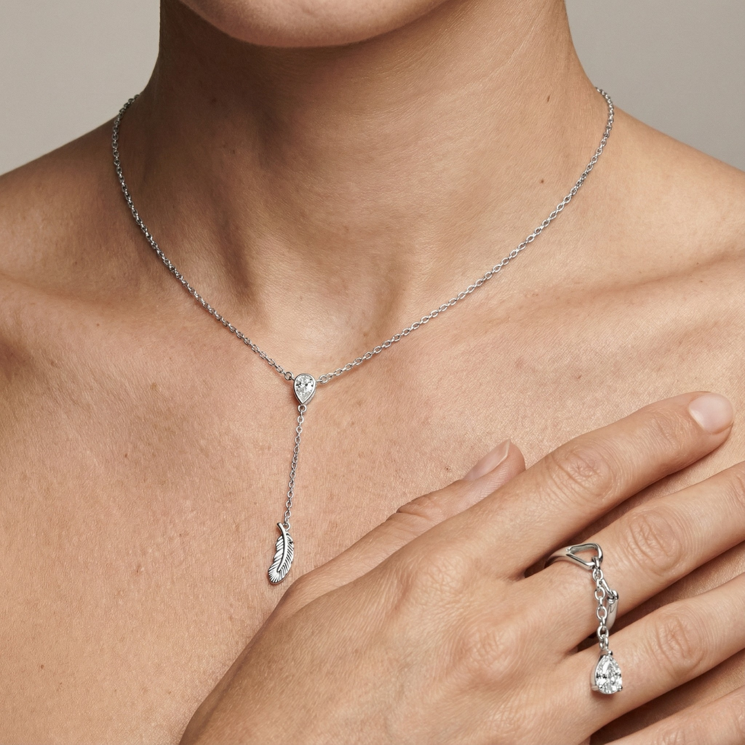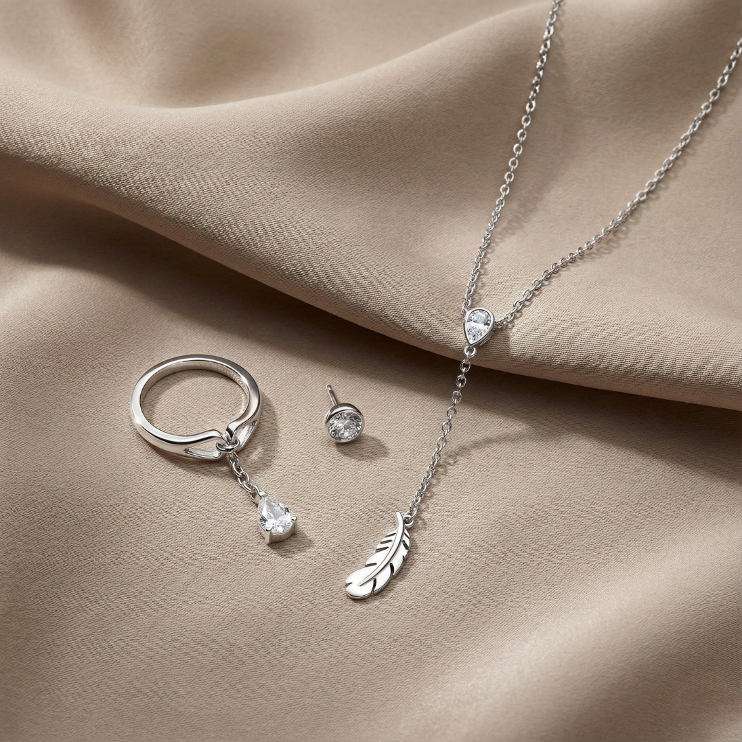 Inspired by fluid movement and natural simplicity, this combo blends clean silver forms with subtle organic accents. The teardrop stone and leaf charm add softness, while the polished silhouettes keep the overall look modern and restrained.