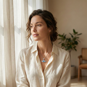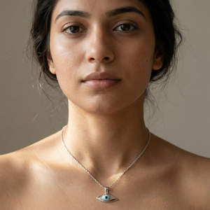 Inspired by modern minimal forms and the protective evil eye symbol, this pendant represents awareness, balance, and positive energy. The slim, flowing design gives it a contemporary and lightweight appeal.