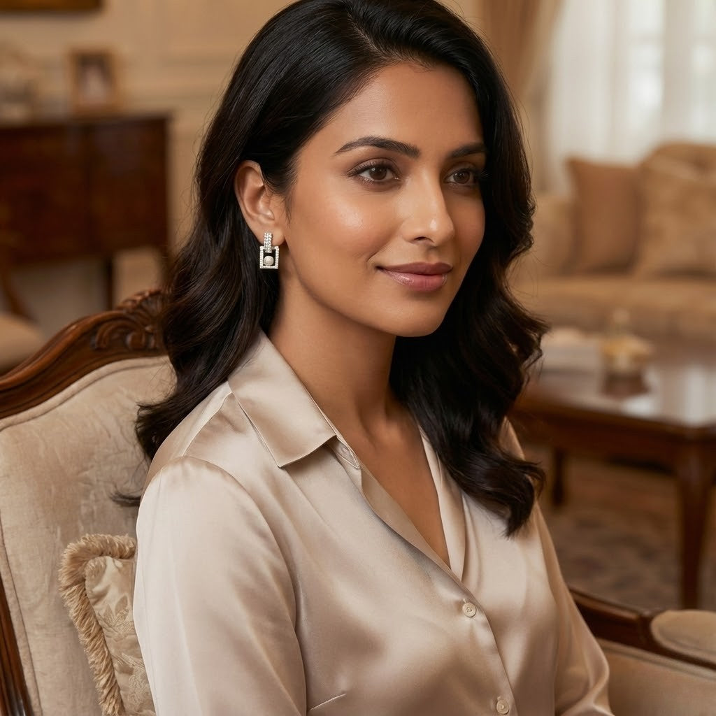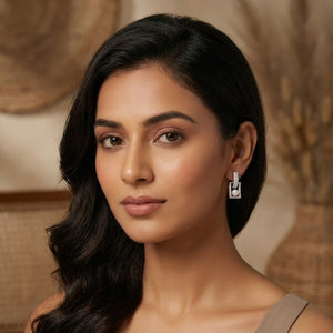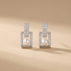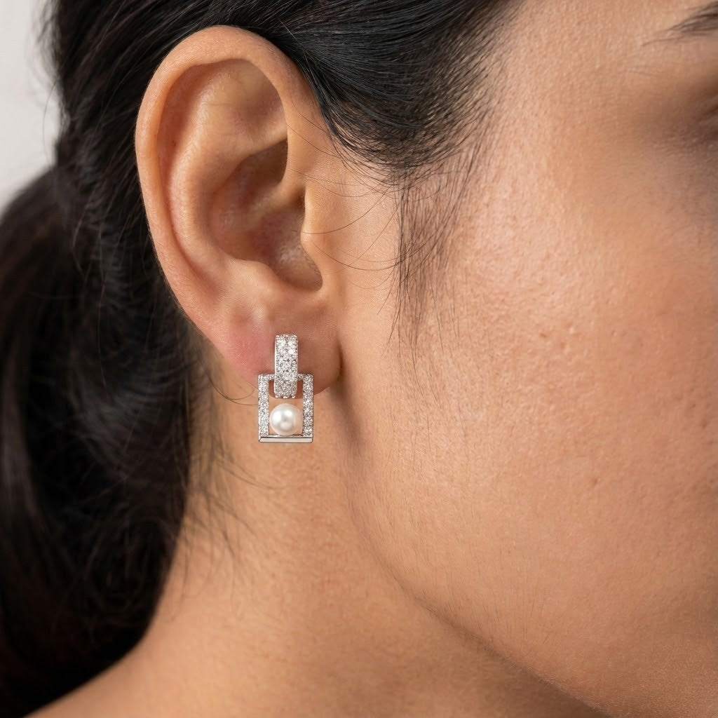 Inspired by modern architectural shapes and timeless pearls, these earrings blend clean geometric lines with soft elegance. The contrast between sparkling stones and a classic pearl creates a refined, contemporary look.